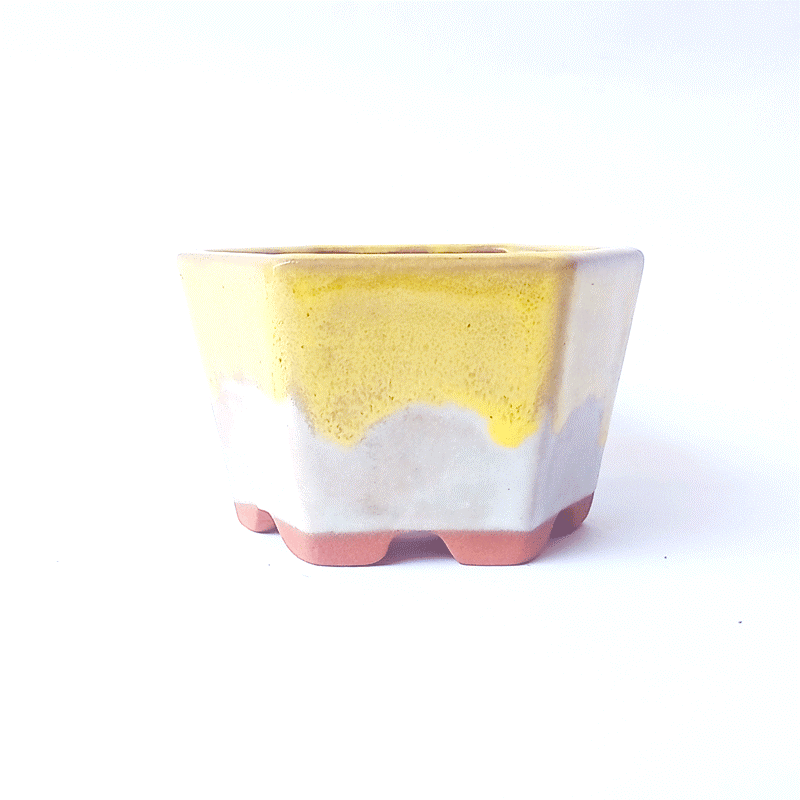 Apresentação: Vaso hexagonal em cerâmica esmaltado cor Amarelo e Branco;